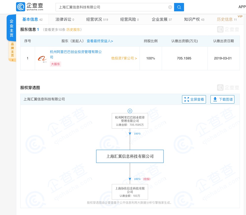 数据显现,中国电商巨子阿里巴巴新增对外出资——上海汇翼信息科技有限公司,持股份额100%。后者实际上也便是团队协作使用 Teambition 的主体公司。